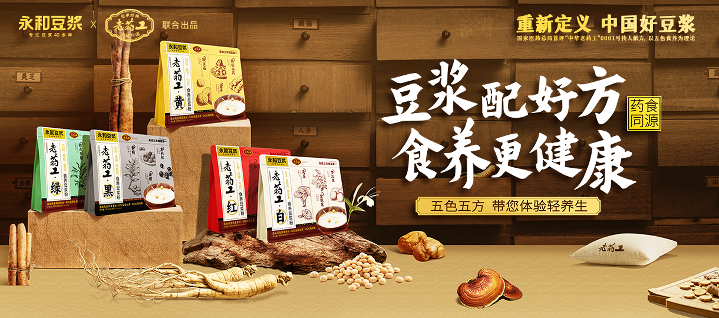 本次展會最引人注目的明星產品,當屬永和豆?jié){與“中華老藥工0001號”的聯名系列。融匯“藥食同源”食養(yǎng)哲學,傳承老藥工古法精髓。永和豆?jié){聯合“中華老藥工0001號喻伯藩”先生傳人喻文定,推出老藥工系列五色食養(yǎng)豆?jié){粉。